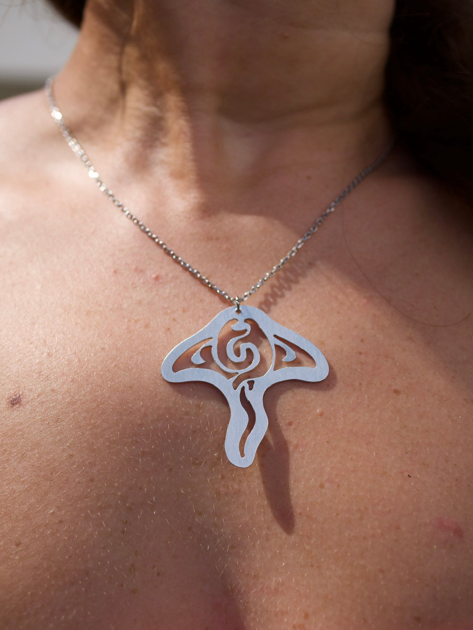 -Placa trabajada a mano en aluminio montada en cadena de stainless steel de 18” pulgadas de largo.